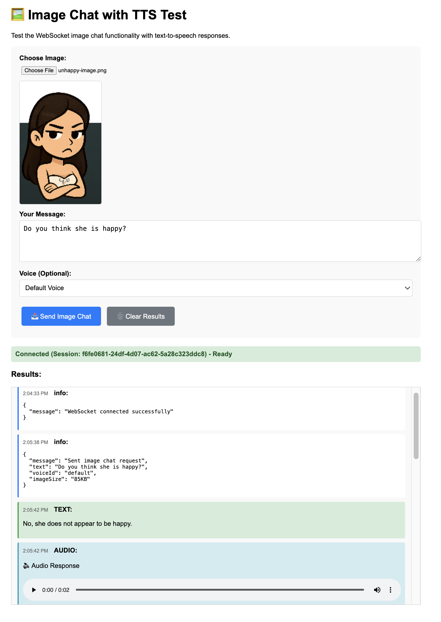 Messages follow a structured format: Client → Server:{ type: "text", text: string }{ type: "audio", audio: number[][] }{ type: "audioSessionEnd" }{ type: "imageChat", text: string, image: string, voiceId?: string }