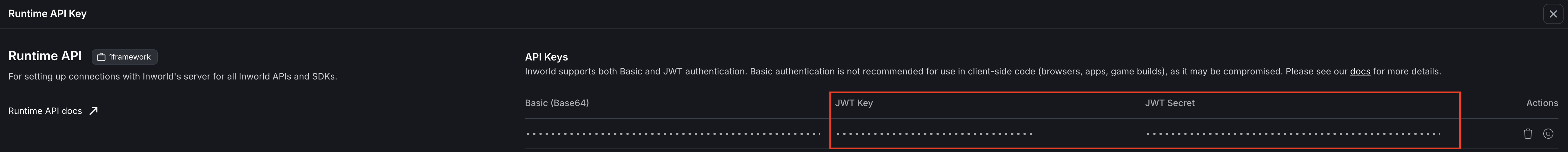 ws://localhost:3000 - API Key and API Secret: Your Inworld JWT credentials (see Authentication)