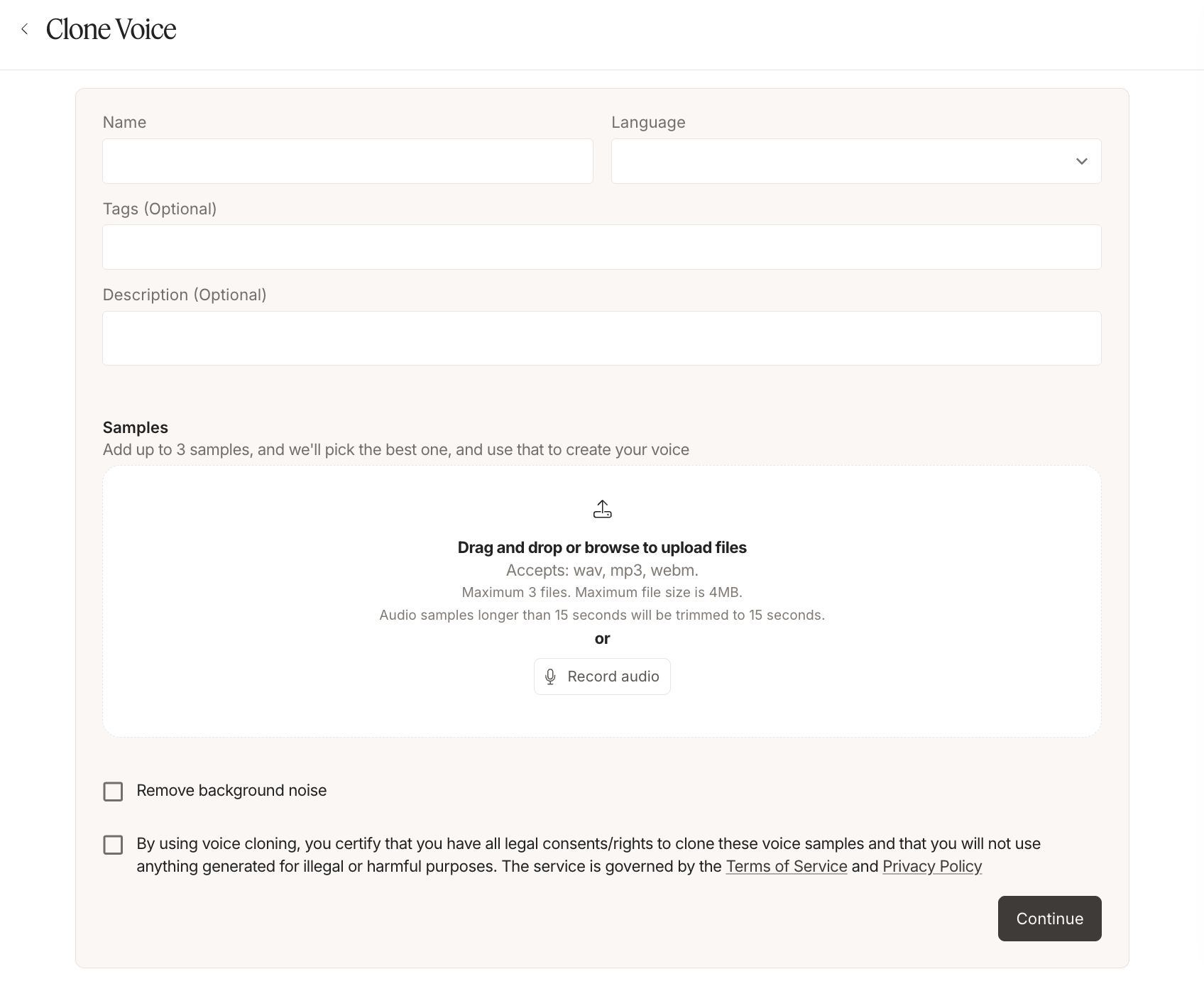 - Upload: Drag and drop or browse to upload up to 3 audio files. Accepted formats: wav, mp3, webm. Maximum total size is 16MB. Audio samples longer than 15 seconds will be automatically trimmed to 15 seconds.