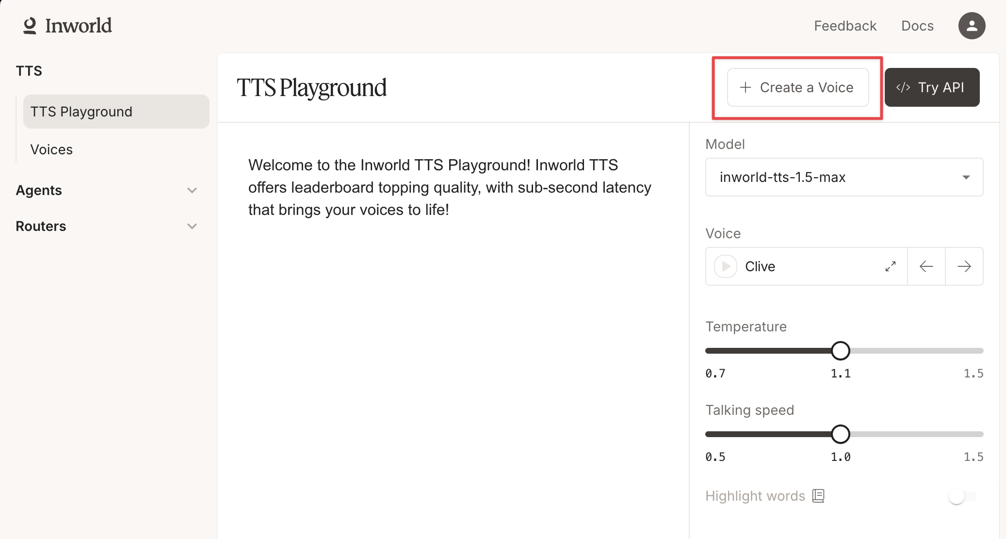 In Portal, select TTS Playground from the left-hand side panel. Click Create Voice and select Design.