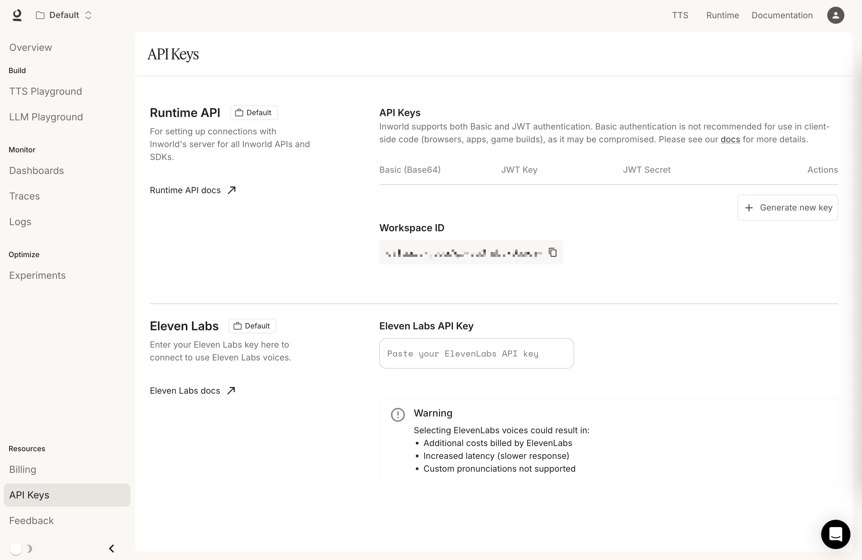 Reach out to support@inworld.ai to enable use of ElevenLabs with your workspace.