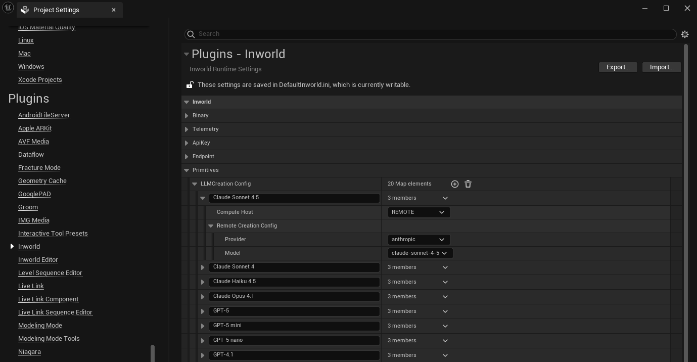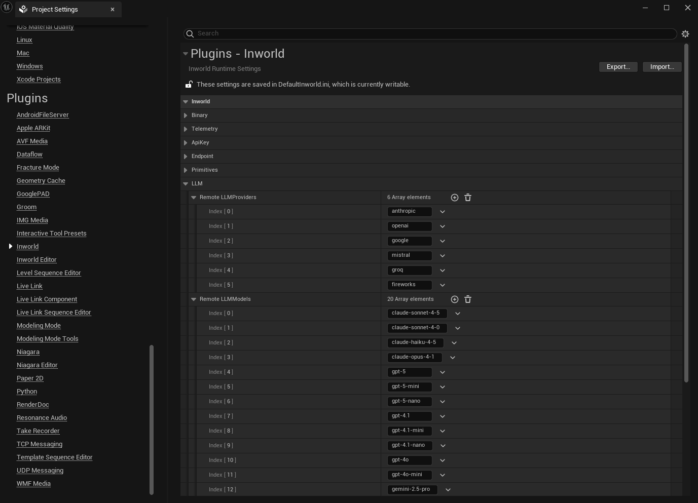 All service providers and models listed under Chat Completion are supported. If a model or service provider is not available in the Remote LLM Creation Config dropdown, you can add additional options under the LLM section of the Inworld Runtime Settings.