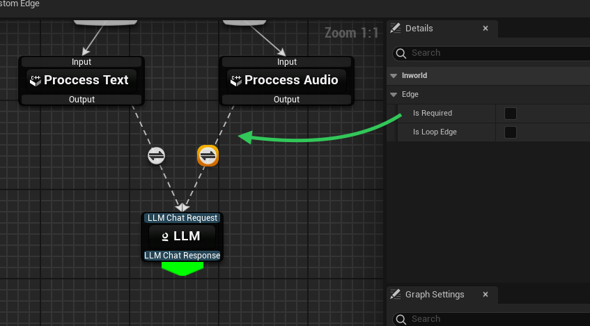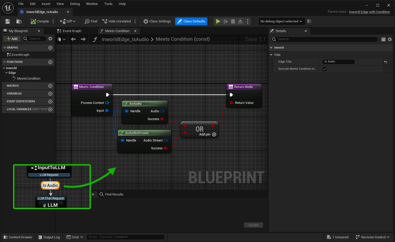- To Open Implementation: double-click on conditional edge widget to navigate to implementation (C++ or Blueprint).