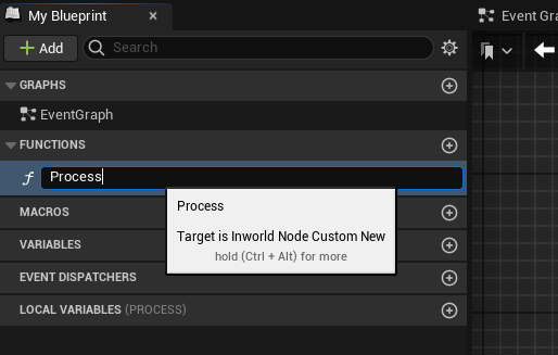 After saving, the custom node’s blueprint. In the blueprint, create a new function prefixed with “Process” (e.g. “Process_Default”).