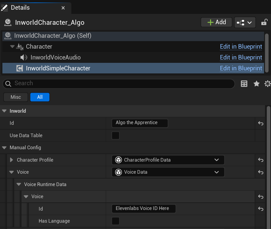 Setup the InworldCharacter component’s Inworld runtime data properties: