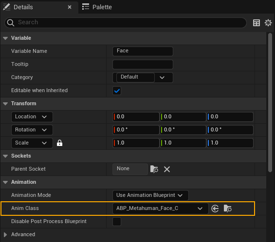 In the Details panel, update the Anim Class to ABP_Metahuman_Face: