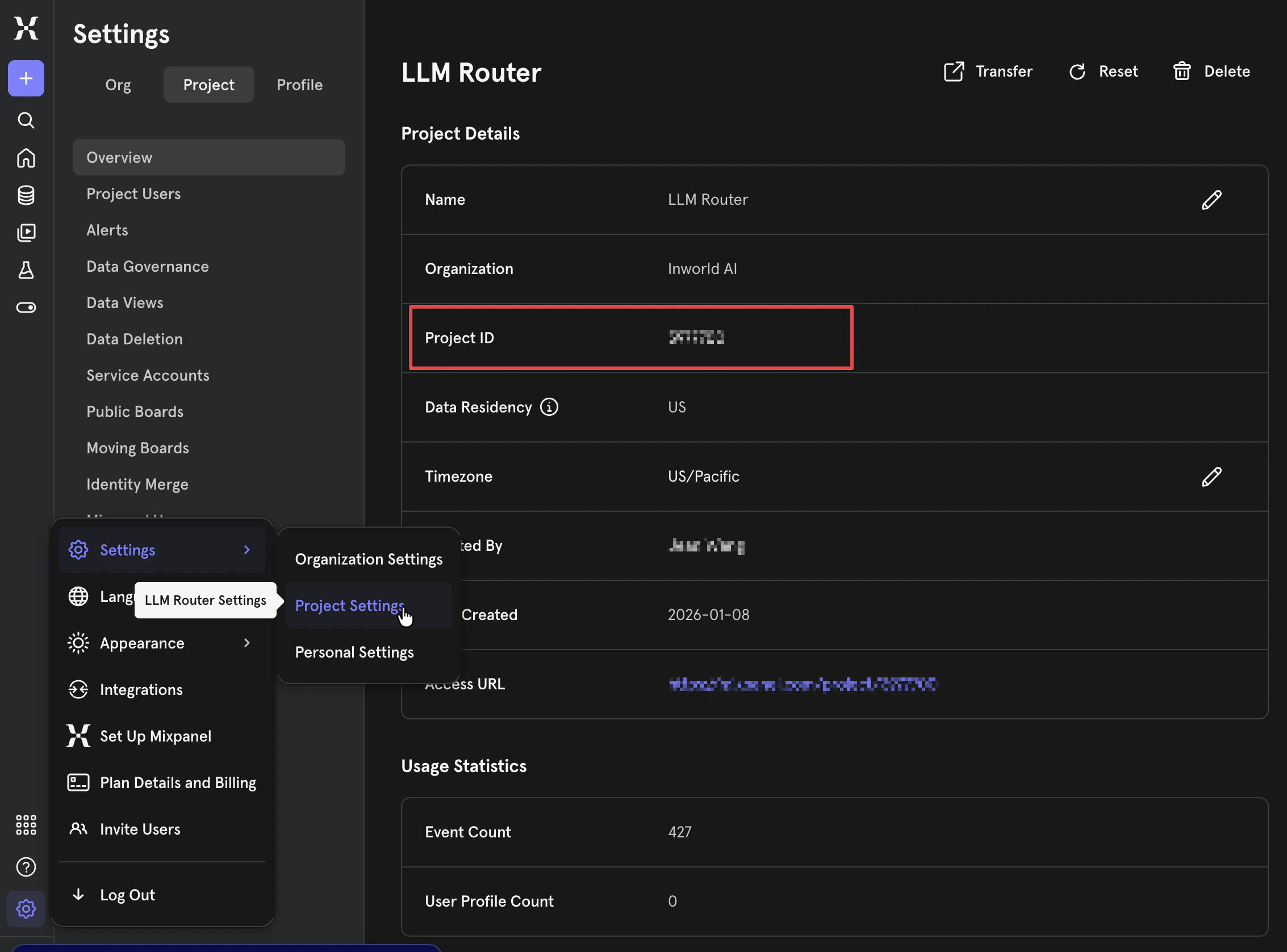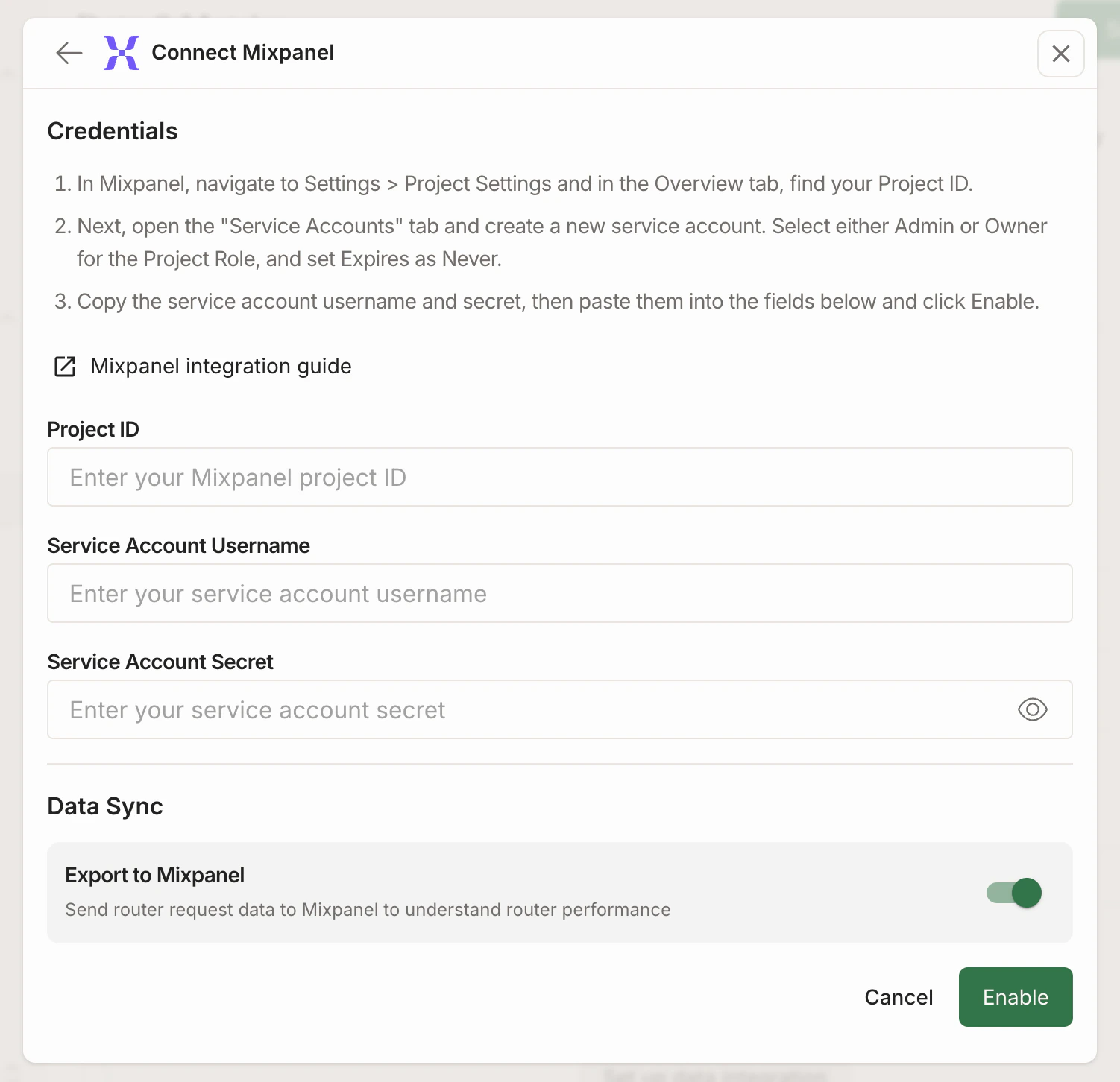 Export router exposure data to your existing Mixpanel project for product analytics. When a user is exposed to a router, it is sent as an event to your Mixpanel project, including details on router, route, and variant — so you can build dashboards and analyze routing performance in Mixpanel.Find your Mixpanel Project ID