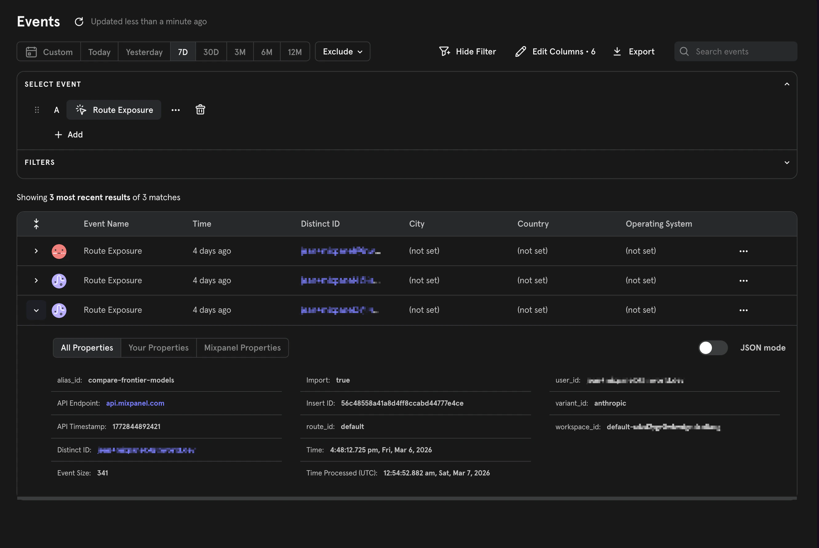 The router exposure data will flow to your Mixpanel project automatically (data will sync every ~8 hours). You will see an event for each router, route, and variant that a user was exposed to every hour.Each event will include: