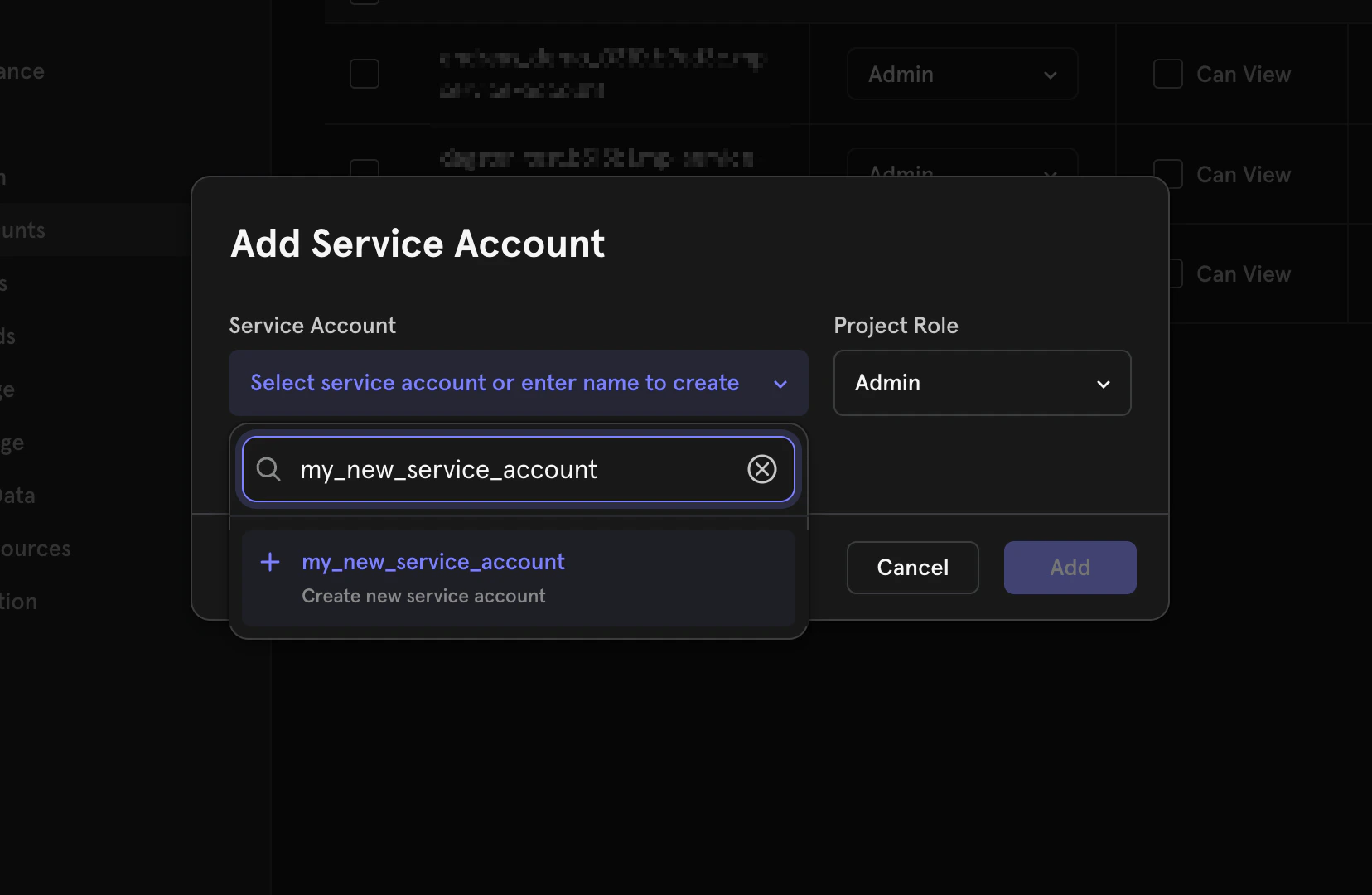 + button to create your new service account. Set the Project Role to Admin or Owner. Set Expires to Never.Click Add and copy the username and secret — you will not be able to view the secret again.Configure the integration in Portal